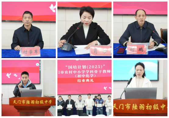 2025年11月19日,由汉江师范学院与天门市教育局联合承办的“国培计划(2025)——天门市农村中学学科骨干教师提升培训(初中化学)”项目结业典礼在天门市陆羽初级中学隆重举行。天门市教师进修学校副校长肖珍、主任付学军、胡耀荣、汉江师范学院继续教育学院副院长付鹏和国培项目团队出席典礼,与全体参训学员共同回顾了近五个月的研修历程,见证了培训成果的丰硕收获。