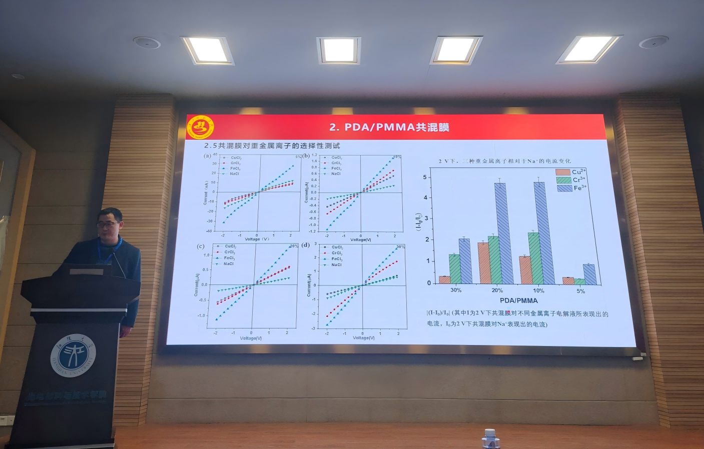 会上,全家鑫围绕“水环境中污染物的检测识别与分离去除”这一前沿议题,以《有机聚合物共混膜的制备及性能研究》为题,系统介绍了其团队在功能化膜材料设计构建及其在水处理应用方面的最新研究成果。报告深入阐述了有机聚合物共混膜的设计思路、制备方法及其对水中新型污染物的高灵敏检测识别与高效分离去除性能,引发了与会学者的广泛关注与一致认同。