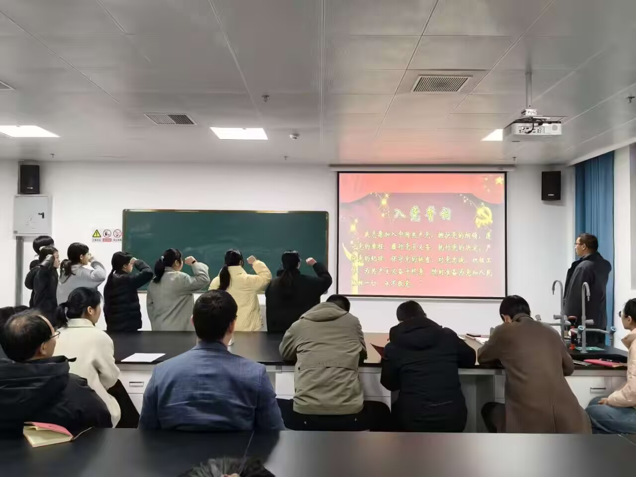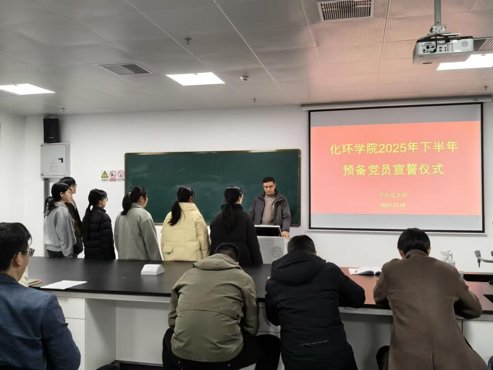 12月18日下午,化学与环境工程学院在明理楼A501教室庄重举行预备党员宣誓仪式,8名新发展的预备党员在党旗下庄严宣誓,正式开启他们为党和人民事业奋斗的新征程,学院党委书记成传明以及学生党支部师生党员共同参与此次活动。